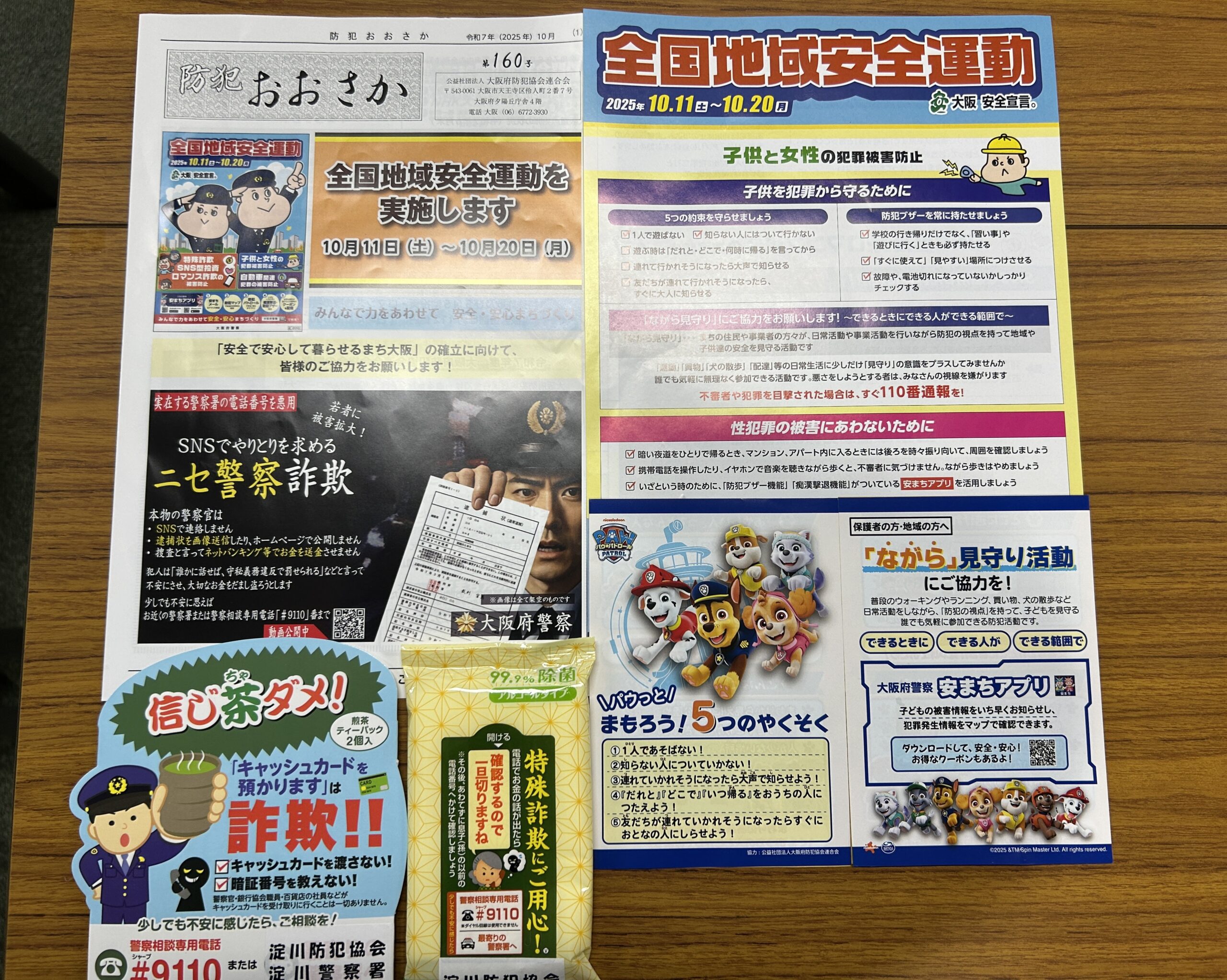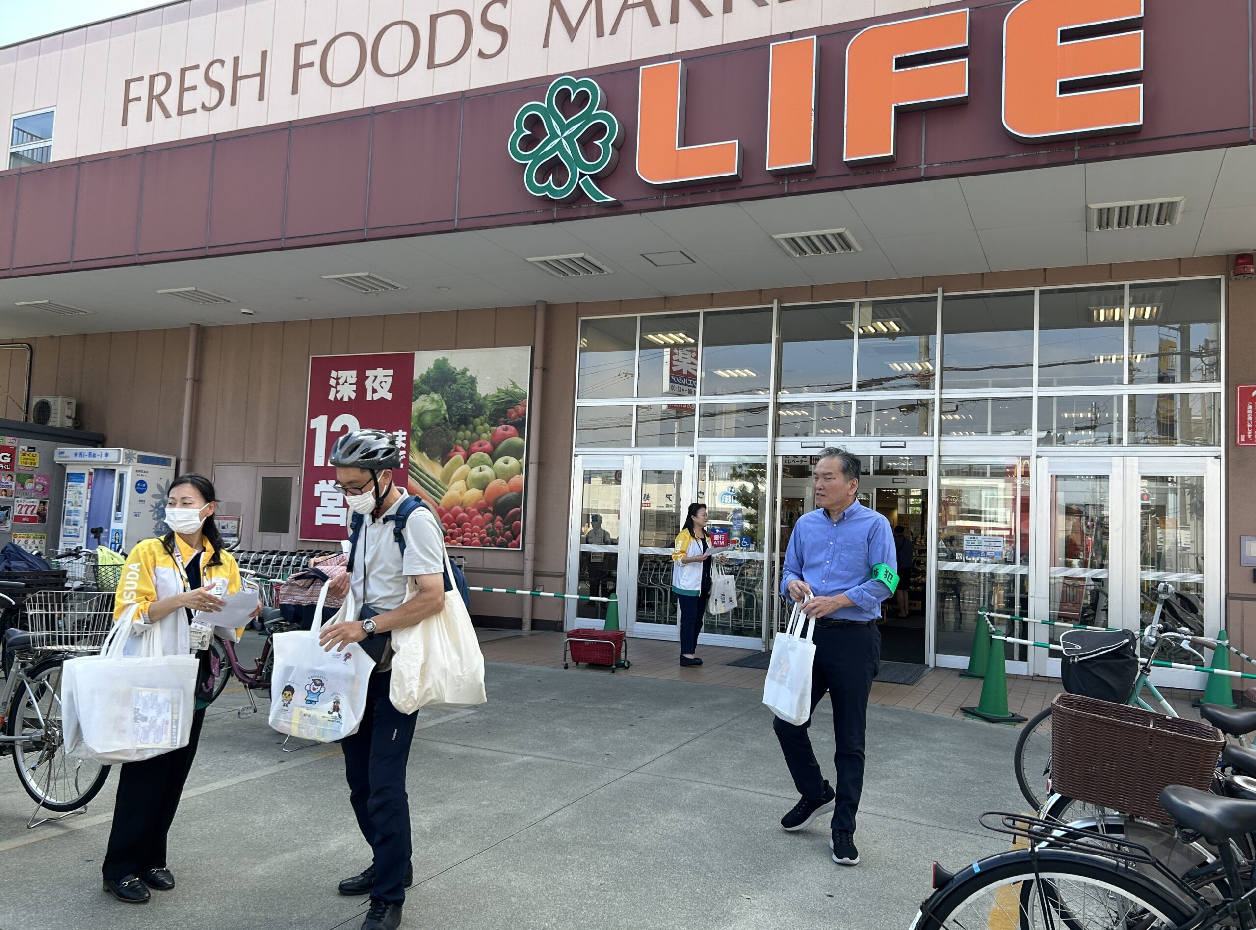 10月14日(火)午後2時から、ライフ三津屋店において、安全安心まちづくりキャンペーンを実施しました。地域安全運動期間中ということもあり、淀川警察・淀川区役所・明治安田生命・加島地区防犯会・三津屋地区防犯会の皆様にもご協力頂き、約20名の参加となりました。啓発品を配布してお声がけをさせて頂きました。