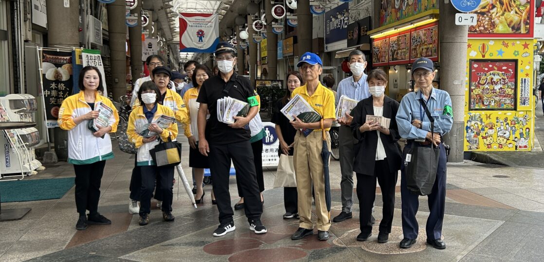 10月16日(木)午前10時から、十三フレンドリー商店街周辺において、特殊詐欺被害防止キャンペーンを実施しました。淀川警察・淀川区役所・明治安田生命・十三地区防犯会・神津地区防犯会・新北野地区防犯会の皆様にもご協力頂きました。特殊詐欺の被害を未然に防止するため、啓発品を配布して声掛けを行ないました。16名の参加となりました。