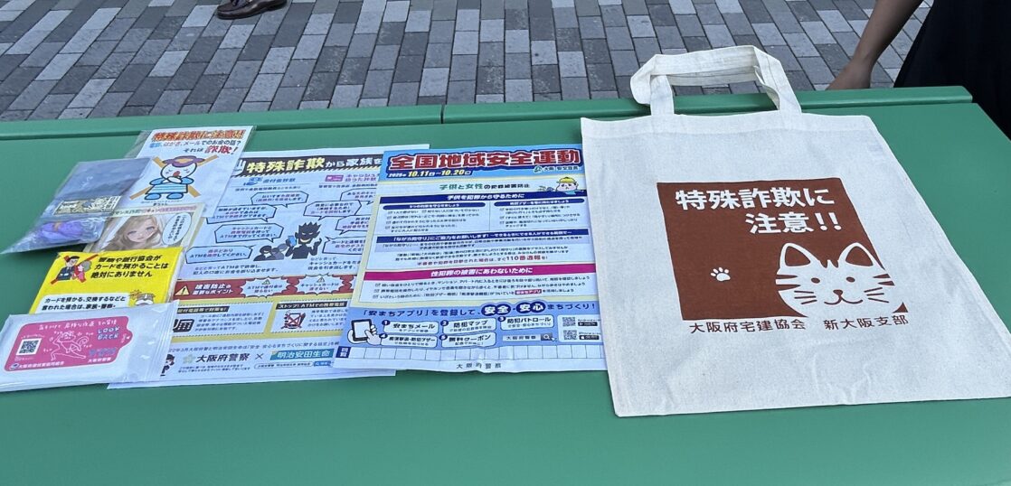 10月17日(金)午前10時から、三菱UFJ銀行新大阪支店周辺において、特殊詐欺被害防止キャンペーンを実施しました。淀川警察・淀川区役所・三菱UFJ銀行・明治安田生命の方々17名の参加となりました。特殊詐欺被を未然に防ぐため、啓発品を配布して声がけを行ないました。