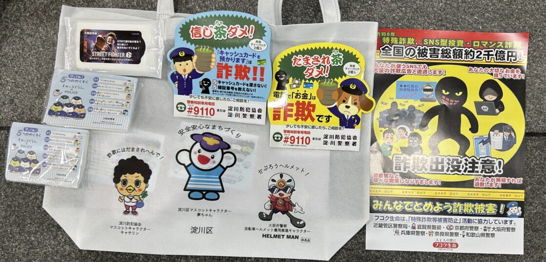 12月11日(木)午前10時から、淀川区役所周辺において、安全・安心まちづくりの日キャンペーンを実施しました。淀川警察署防犯係、太田黒係長より「最近は、20代・30代の若い人達も特殊詐欺の被害に遭われている傾向があります。被害に遭われないよう、お声がけをお願いします。」とお話がありました。