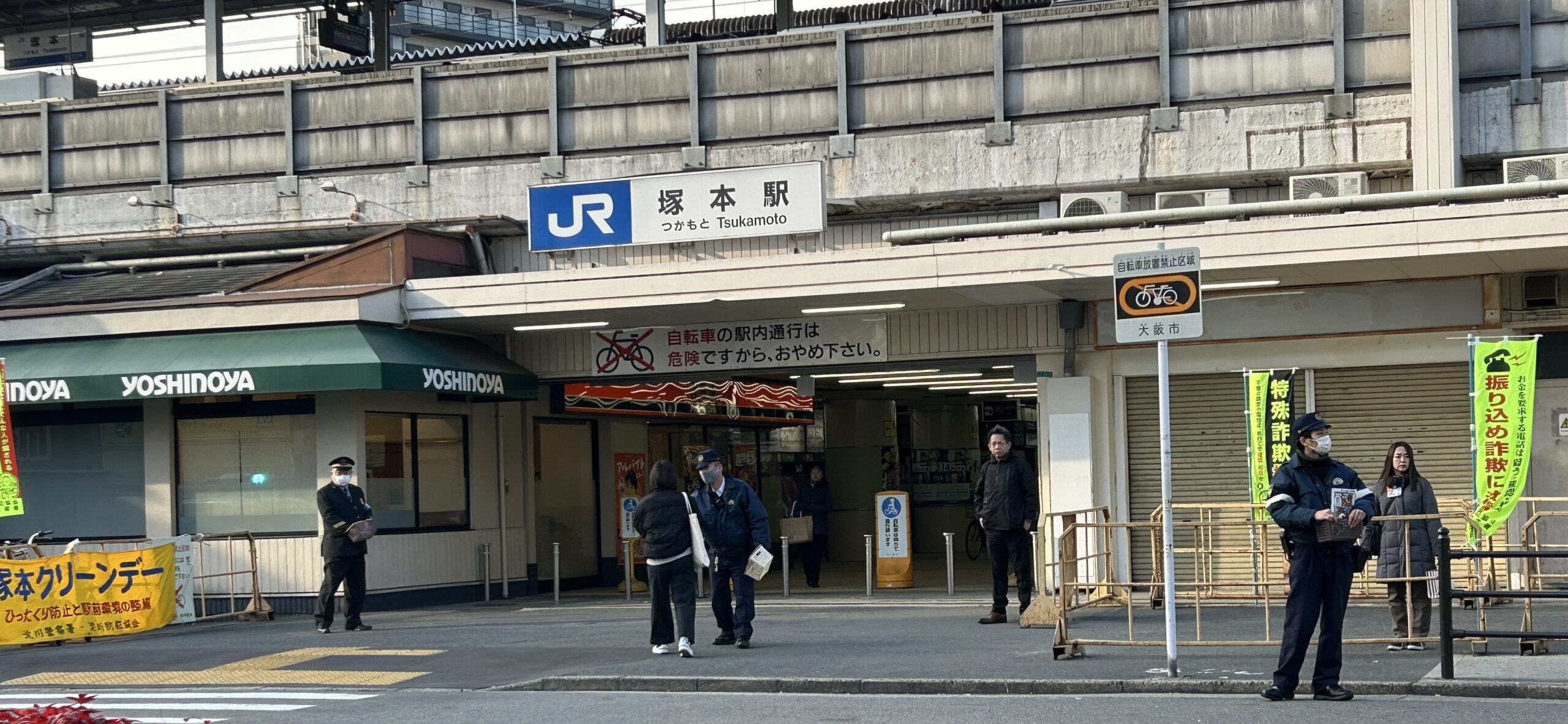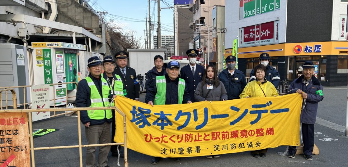2月18日(水)午前8時30分から、JR塚本駅周辺において、塚本クリーンデーを実施しました。今年初めての開催となりました。淀川警察、淀川区役所、JR塚本駅田中駅長様、塚本地区防犯会等、15名の参加ご協力を頂き、啓発品の配布と声掛けを行ないました。