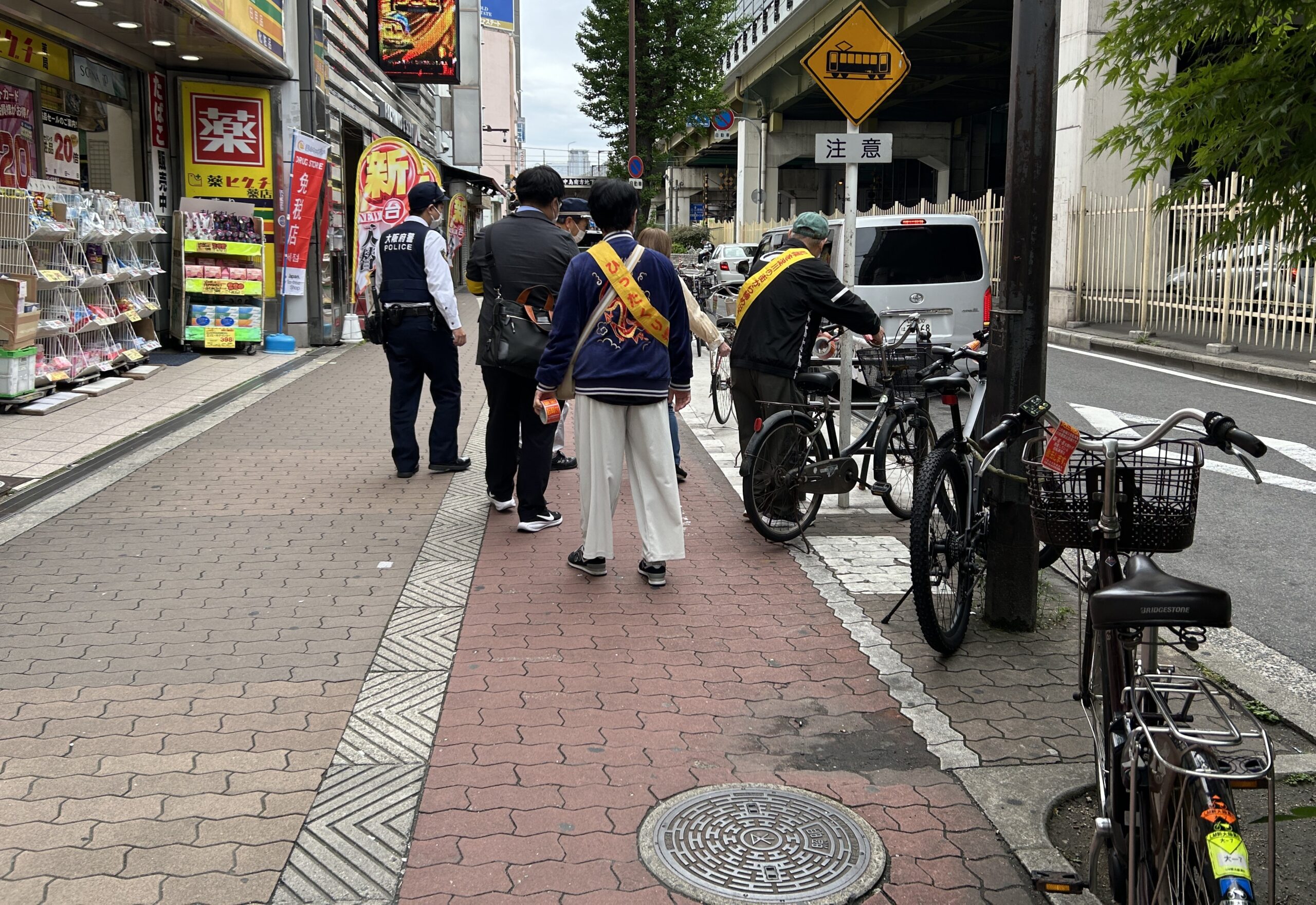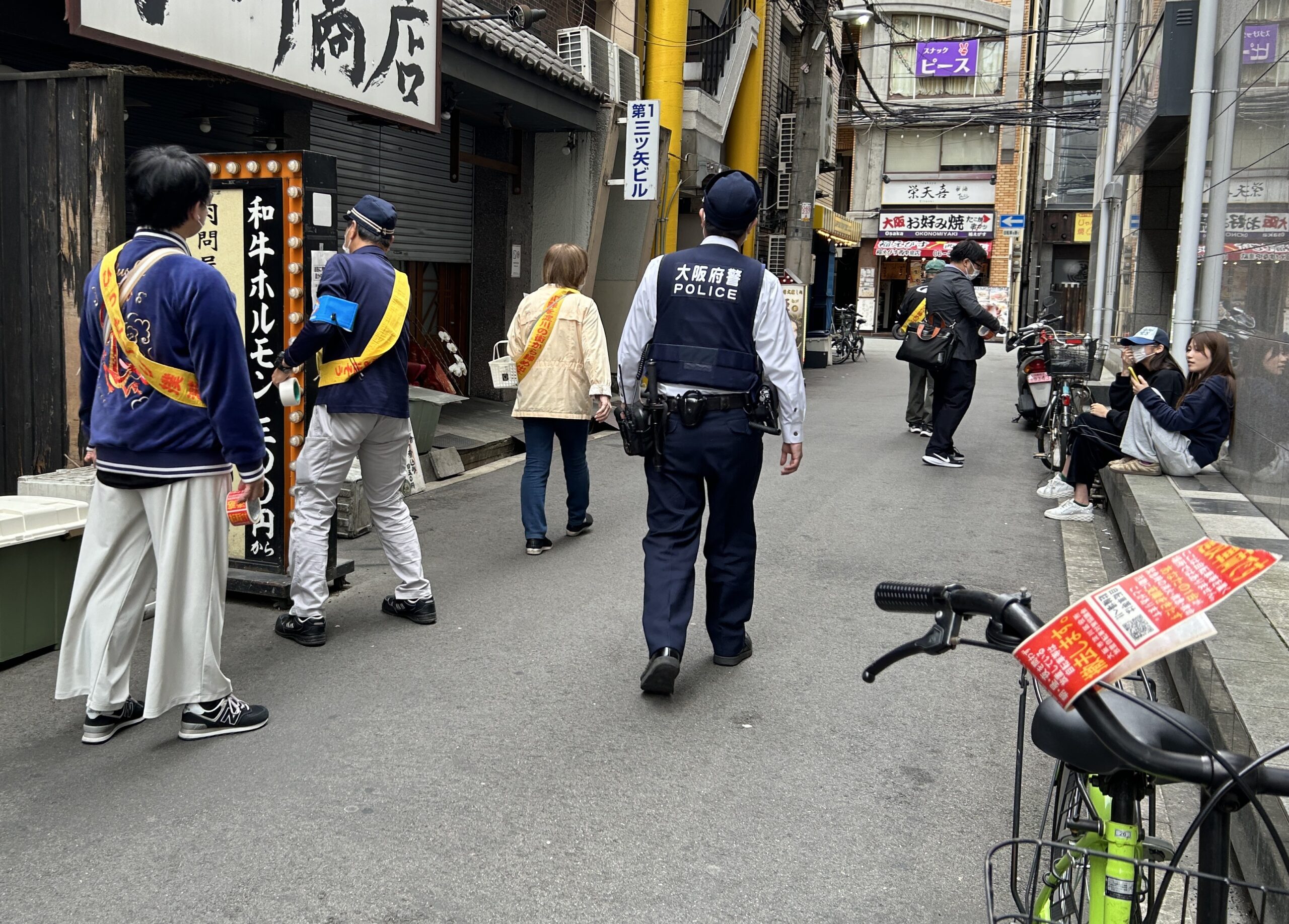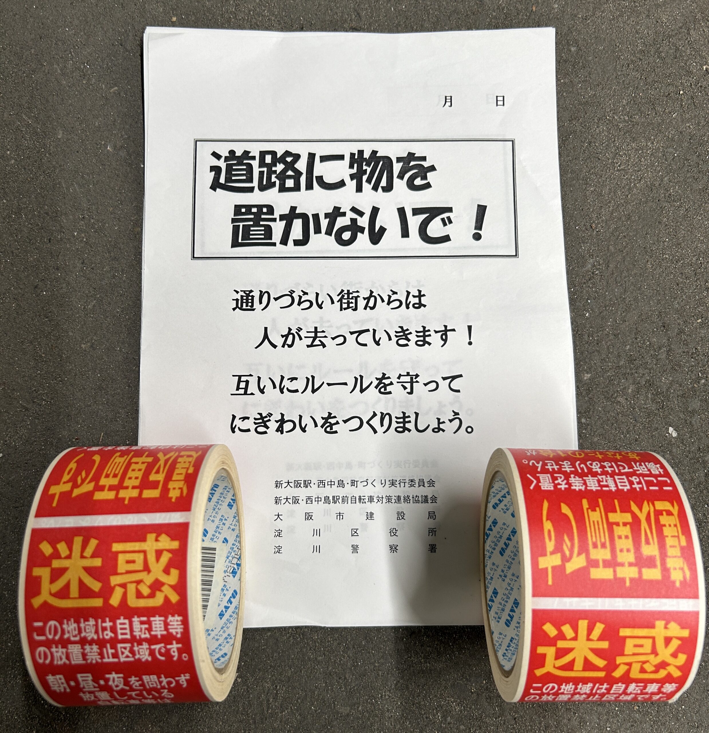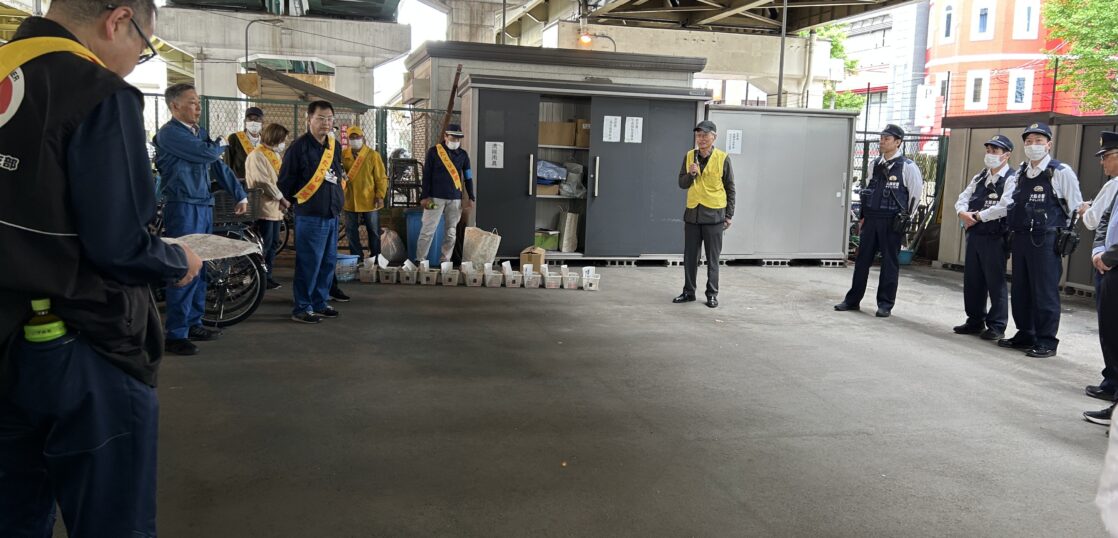 4月24日(金)午後1時30分から、阪急南方・地下鉄西中島南方周辺において、西中島クリーンデーを実施しました。淀川警察署から、「歓楽街対策等、西中島地区の環境を良くしていくために協力をお願いします。」とお話が、ありました。はみ出し広告看板の撤去啓発並びに放置自転車の撤去警告等、それぞれシールを貼付して啓発活動を実施しました。今年度初めてとなるクリーンデー、32名の参加となりました。
